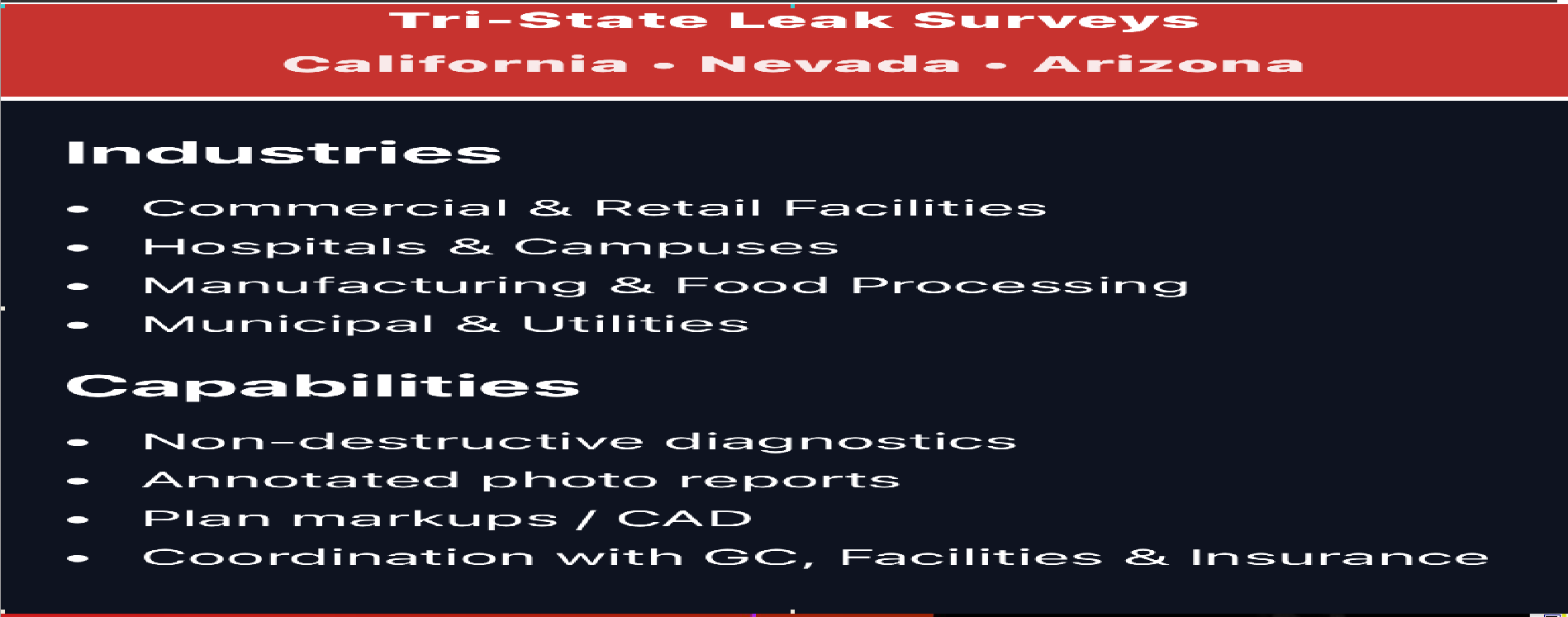tility Locators San Bernardino,Riverside,Los Angeles,Orange,San Diego,Ventura CountShear Wall Inspections. Utility Locators San Bernardino,Riverside,Los Angeles,Orange,San Diego,Ventura  Concrete IDeputy Inspection Service. Call Now! Friendly & Personable · Last Minute Scheduling · 24 Hour Text & Call · Competitive Pricing Seox.  Private Utility Locating When Needed: For private lines and systems not covered by the service, including: Irrigation systems  Parking lot lighting  SecurUtility and fire control systems  Storage tanks  Process sewers  How it Works: Private locators use advanced technologies: Electromagnetic Locators: These use transmitters and receivers to detect signals on conductive lines.  Ground Penetrating Radar (GPR): A non-invasive tool that uses radar waves to map underground ities and structures.  Prevent costly damage, project delays, and safety risks associated with hitting private lines.  Utility Marking Colors  Once located, underground ities are marked using universal spray paint colors to identify their type. Red: Electrical, conduit, lighting Orange: Telecommunications, TV, alarm, signal Yellow: Gas, oil, steam, petroleum Green: Sewer, storm drain Blue: Potable water Purple: Reclaimed water, irrigation Pink: Temporary marking White: Proposed excavation Utility location - Wikipedia Utility color codes are used to identify existing underground ities in construction areas, to protect them from damage during ... Wikipedia How Utility Locators Work as their cathotic protection for corrosion. not used as often. but these are some of the passive modes that we have an... Private Utility Locating Services - Comprehensive Damage Prevention. The law requires that you prior to digging to have underground ities marked. However... Show all Show more Businesses Buon Utility Locating 5.0(3) · Utility contractor San Juan Capistrano, CA Open 24 hours · "He even provided a detailed map of my ities for future reference." Website Route SoCal Locators y contractor 3+ years in business "They are our go-to team for private Utility locating." Website Enhanced Scanning (Utility Locating)· Utility contractor 5+ years in business Closed Website More businesses Open in Maps People also ask What is the meaning of Utility locator? What is the highest pay for a Utility locator? How much does a private Utility locate cost? How do Utility locates work? Feedback Superior Underground Utility Locating & Mapping Ground Penetrating Radar Systems  › services › Utility-locating-s... Superior provides comprehensive digital and PDF Utility maps of every Utility on site, whether public or private – including depths. Utility location wiki › Utility_location Utility locating is the process of identifying and labeling public Utility mains that are underground. These mains may include lines for telecommunication, ... Find related products & services GPR locating equipment Underground Utility locator near me Water line locator service near me Utility locators for sale Residential Utility locator near me Private Utility locating cost These searches help you find relevant offers from adveisers Superior : Underground Utility Location and Damage Prevention Superior www.Superiorutilitylocators .com Superior locates and marks these Utility lines to prevent damage and service disruptions and keep excavators and our communities safe. Careers Public Utility Locating Private Utility Locating Services Underground Utility Locating: How it Works & Common ... 4M  › blog › overview-under... Oct 11, 2023 — In this aicle, we'll look at common methods of underground Utility locating, how they work, and why they're so impoant. Utility Locators - Products Electronics › Products Subsite offers a comprehensive line of Utility locators and beacons that deliver Underground Awareness. With innovative features and cutting-edge accuracy. Private Utility Locating Services -  › services › private-Utility-locating locates all underground ities and structures, including those which are privately owned and not required to be marked by . Utility Locating Service & Underground Utility Locator Locate Private Utility Locators offering Underground Locating and Mapping Services in all Arizona and Southern California counties. Call (888) Contact Us Trusted Utility Locating Service... Utility Mapping Careers How Underground Utility Locating Works Ground Penetrating Radar Systems  › Industry Insights Utility locating involves izing technology such as ground penetrating radar (GPR) and electromagnetic (EM) locating to detect and map power, gas, water, ... Private Underground Utility Locator Services, Wires & Line Company  › private-Utility-locating Penhall Technologies, a leader among Utility locator companies, provides comprehensive private Utility locating services for construction and demolition .. Riverside County, California 92503 in Riverside, CA County 92509 in Rubidoux, CA County 92553 in Moreno Valley, CA County 92882 in Corona, CA County 92201 in Indio, CA County 92507 in Riverside, CA County 92592 in Temecula, CA County 92557 in Moreno Valley, CA County 92504 in Riverside, CA County 92879 in Corona, CA County 92234 in Cathedral City, CA County 92506 in Riverside, CA County 92544 in Valle Vista, CA County 92530 in Lake Elsinore, CA County 92505 in Riverside, CA County 92570 in Perris, CA County 92562 in Murrieta, CA County 92543 in Hemet, CA County 92260 in Palm Desert, CA County 92571 in Perris, CA County 92545 in Hemet, CA County 92220 in Banning, CA County 92591 in Temecula, CA County 92262 in Palm Springs, CA County 92225 in Blythe, CA County 92253 in La Quinta, CA County 92551 in Moreno Valley, CA County 92236 in Coachella, CA County 92240 in Desert Hot Springs, CA County 92860 in Norco, CA County 92881 in Corona, CA County 92583 in San Jacinto, CA County 92211 in Palm Desert, CA County 92595 in Wildomar, CA County 92501 in Riverside, CA County 91752 i